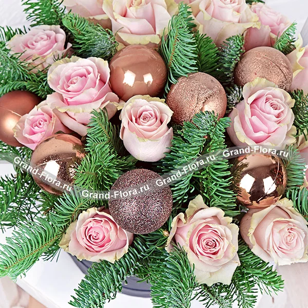 Стандартный: роза розовая - 7 шт., ель, шарики - 5 шт., оазис, коробка.